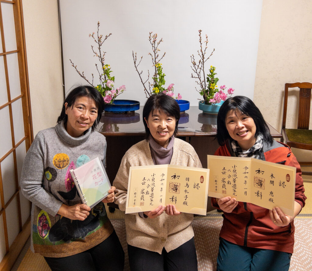 自宅教室では、少人数で基礎から応用まで幅広くいけばなの楽しさを学んでいただいています。もちろん本格的に学びたいかたは小原流のお免状も取得できます。